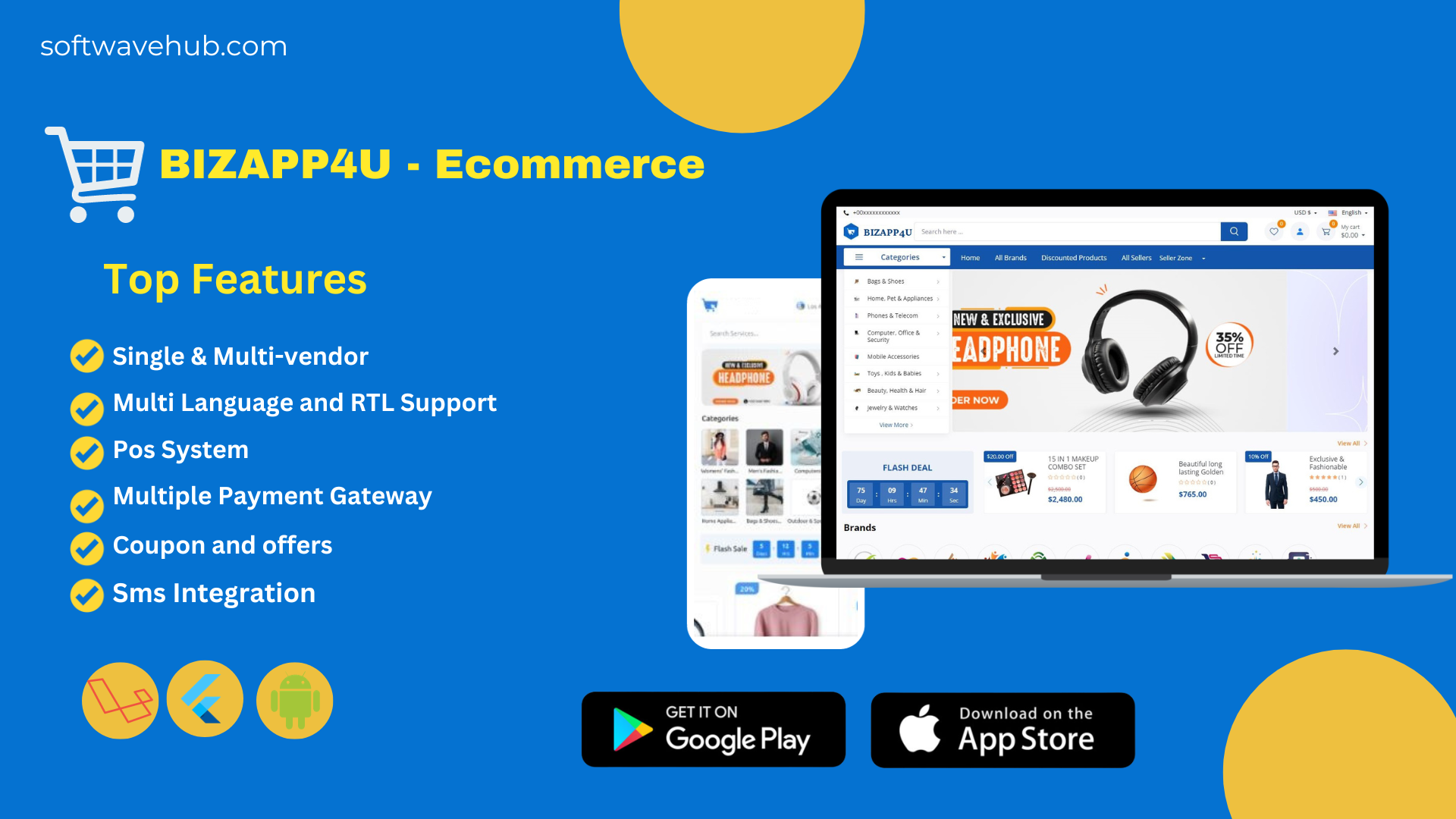 PHP Laravel is used to develop both the Web frontend and Admin panel for BIZAPP4U. It will also be available on iOS and Android thanks to Flutter’s cross-platform development!