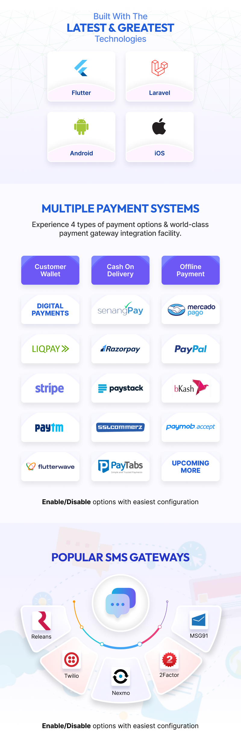 Payment Methods: The system supports popular payment methods such as SSLCOMMERZ, PayPal, Stripe, Razorpay, SenagPay, PayTabs, Paystack, PayMob Accept, Mercado Pago, LIQPAY, Flutterwave, Paytm, and bKash, offering both digital payment and cash delivery options.