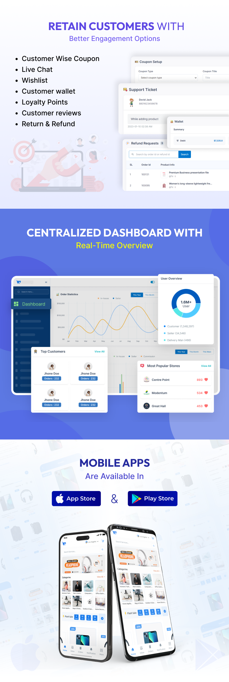 User Management: The admin panel offers comprehensive customer and seller management tools, including live chat for customers.